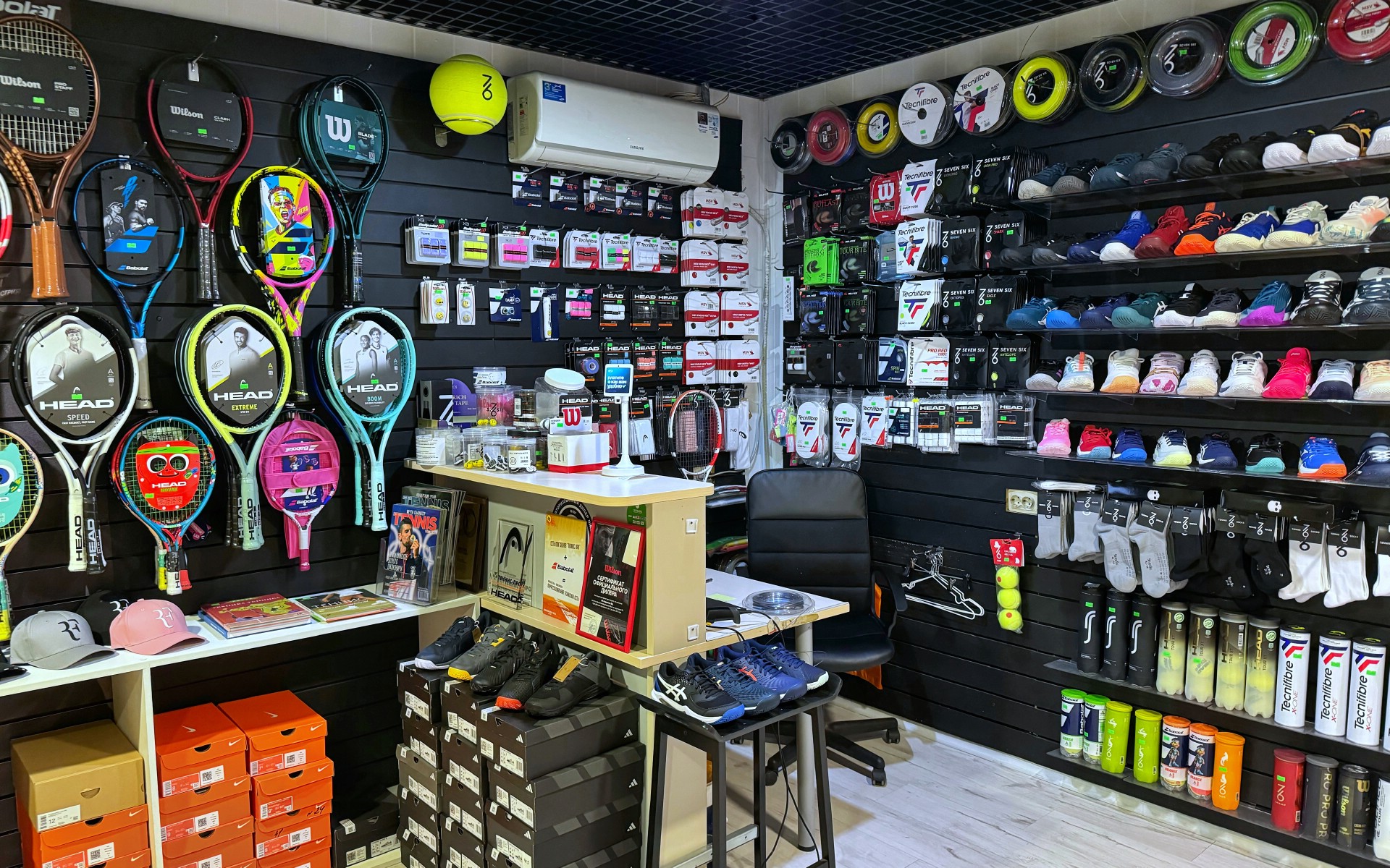 Очень удобно, когда рядом с теннисными кортами есть магазин, в котором каждый клиент может выбрать себе подходящую экипировку, а продавец-косультант поможет подобрать соответствующую по размеру, весу и другим параметрам теннисную амуницию.