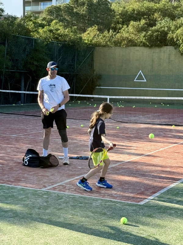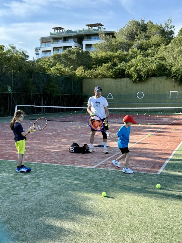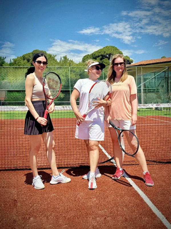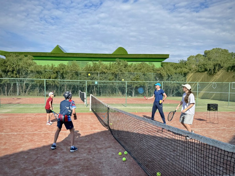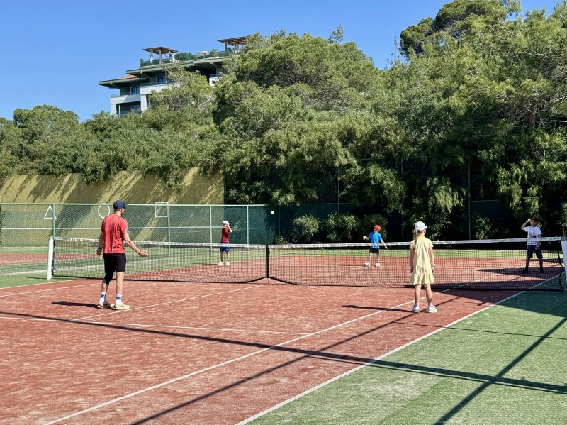 По утрам тренеры проводили для взрослых полноценную тренировку, где всех участников разбили на группы - у новичков была возможность осваивать азы тенниса в своем темпе, а продвинутым любителям были предложены различные варианты игры в зависимости от количества человек на корте. Тренировки получились максимально полезными, динамичными и веселыми!